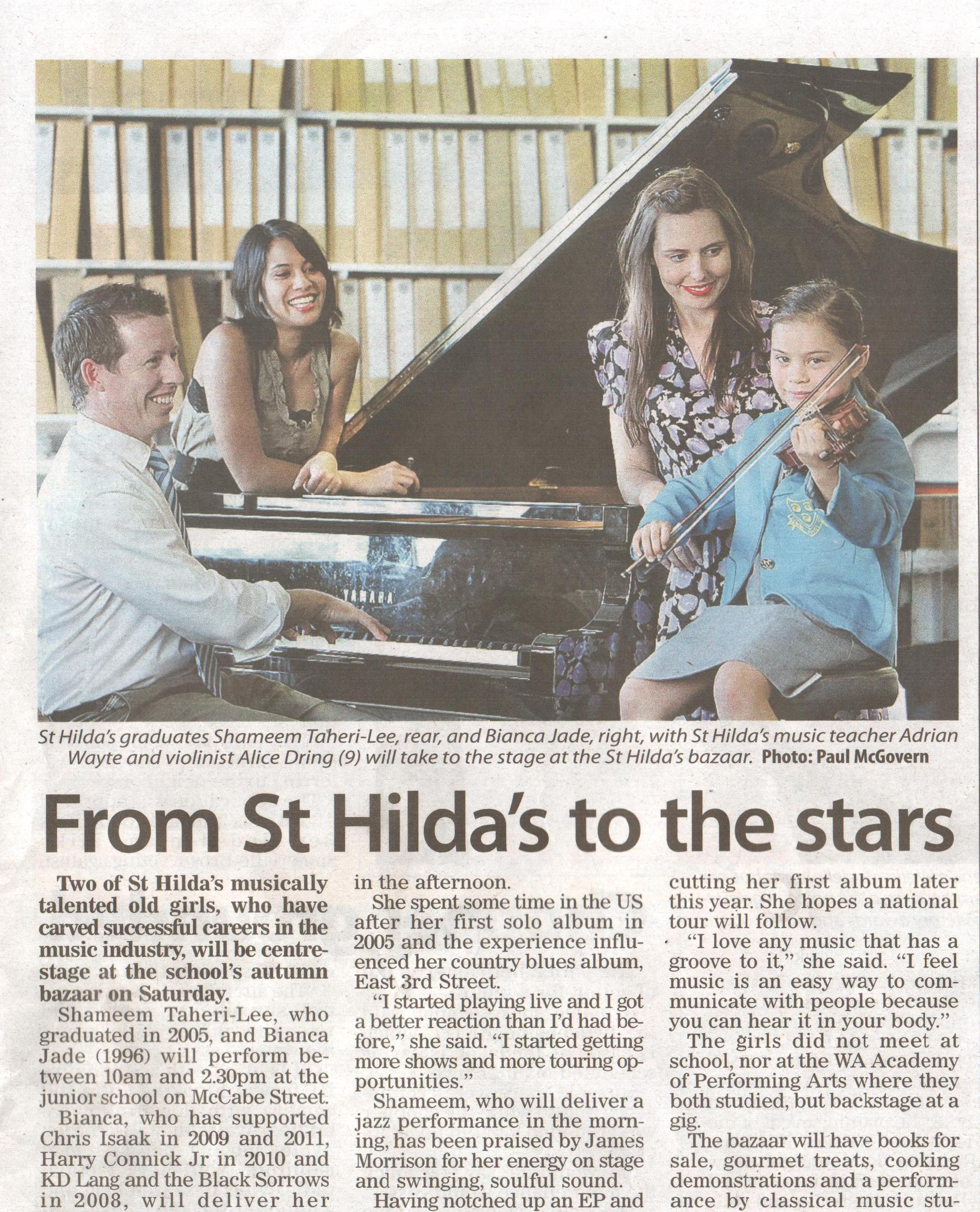 Shameem Taheri-Lee, who graduated in 2005, and Bianca Jade (1996) will perform between 10am and 2.30pm at the junior school on McCabe Street. Bianca, who has supported Chris Isaak in 2009 and 2011, Harry Connick Jr in 2010 and KD Lang and the Black Sorros in 2009, will deliver her trademark acoustic melodies in the afternoon.